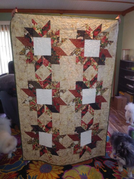 I cut this for a neighbor that wanted to learn to quilt. She lasted about as long as it took me to cut then she wasn’t interested anymore. No use wasting fabric, so I finally pieced the top and just got the quilting and binding done this week. The white centers don’t stand out in person near as much as they do in the pictures. They are actually a light cream color. It’s really pretty Christmas colors so eventually I will gift it to someone that will love it.