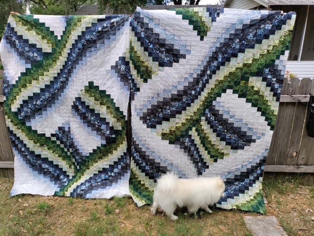 My bosses daughter decided to get married right after the April tax deadline so I had to put everything on hold and make her a wedding quilt. She wanted something much more modern than her sister and choose the bargello pattern. Since she didn’t want bed size I made her 2 matching sofa quilts. I was wondering how it would look as she said she doesn’t like a lot of color then choose navy, grey and said maybe some green but nothing bright. That is so not me but I think they came out quite clean and classic looking. I forgot to get another picture after adding the borders and quilting them.