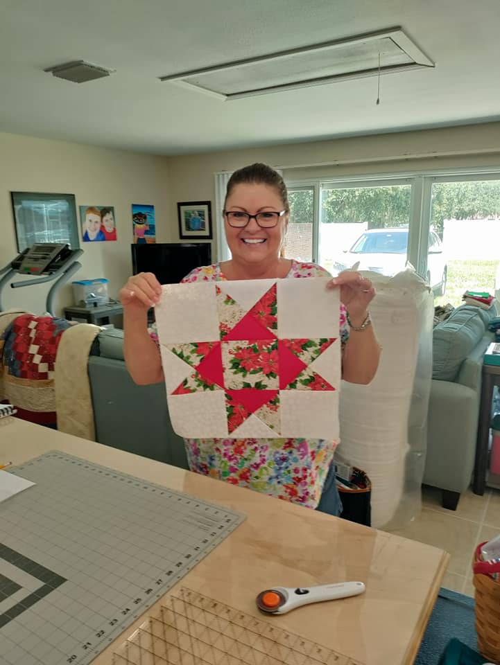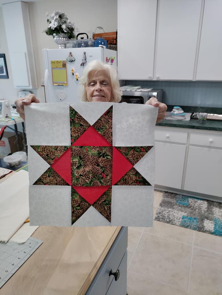 Then there is Marilyn and Pam. WOW. They have taken to quilting like fish to water. I love seeing them learning new things but also being so excited about a quilt once it’s done. I especially love seeing they don’t settle. If it isn’t right they stop, take it out and strive to do the best they can to make it perfect. They have started heir women of the bible quilts which will be a big endeavor. Both have decided to use Christmas fabrics so it can be displayed in their home once it’s finished. Here they are last month showing off block one – Eve.