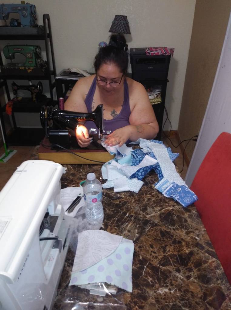 Tonia just joined us this year but I think she’s a quilter at heart. She’s working on her 4th or 5th one already. I love seeing her open new fabrics and you immediately see the wheels in her head start turning wondering what she’ll make with that fabric. Here she is playing with her original machine, a 1950’s Singer 99. She has an ungraded Juki now but I hope she keeps the 99 as it will last forever.