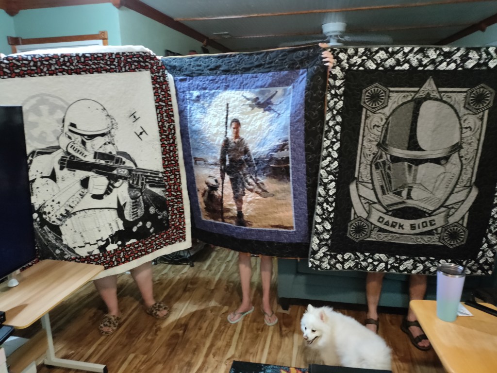 Pam is working on her hexagon quilt which is coming out amazing. Marilyn is currently going crazy as she’s had family staying for a month and hasn’t been able to use her sewing room. Luckily she is back at it this week. Tonia is busting them out like crazy. She’s made a couple of Christmas tree skirts she sold and just finished 3 star wars panels she has sold as well.