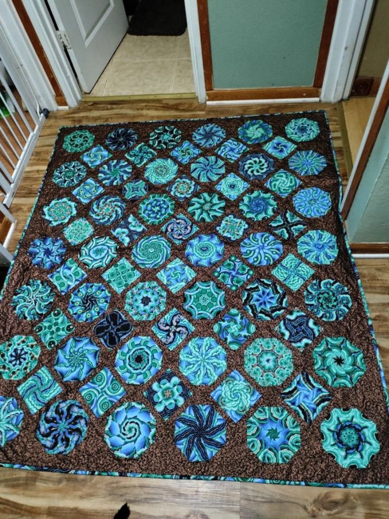 I finally got time to sit and bind one of my tops. Luckily I think I only have 2 more left to finish and they are waiting for a friend to baste them. I feel like I’ve become addicted to making stack n whack quilts. I know they are simple but I love seeing what they turn out to be. Funny my sister used to tell me I had a form of ADHD. She said they thrill for me was seeing what it turned out to be and then I’m ready to move on. I think she was right. I get the blocks done, know what it will look like, then force myself to finish them. But I always do even if I don’t like them. Fabric is too expensive, especially after all the Covid crap.