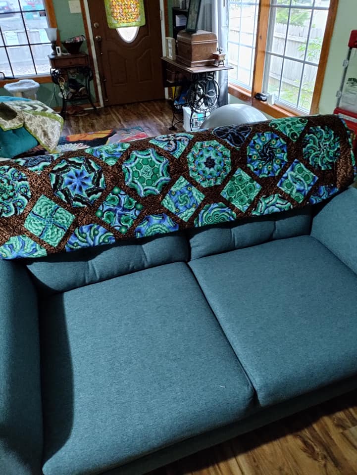 It’s made using Philip Jacobs agate in green colorway and QT bronze swirl fabric. I love it with the new sofa. No one will ever comment my rooms need more color. I hate being blah.