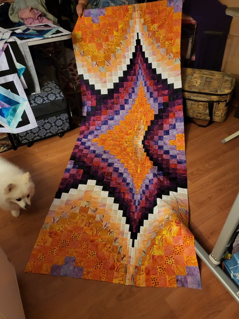 I am trying to get back my love of quilting. I have definitely decided 2022 I will be sticking to the idea I have each year to slow down and take the time to do patterns I have been wanting to do. There will be no deadlines and I won’t be taking any requests for quilts. I did get this new bargello started. I decided to go bold with the colors. In my head it worked out well but I think it’s an all or nothing color. It will either be amazing or hideous. Time will tell. I’ve finished 25 of the 70 rows needed to make the design. Tonia was gracious enough to let me try and lay it out in her room away from the dogs but of course one photo bombs it.