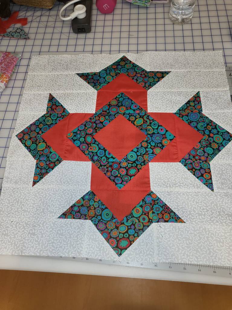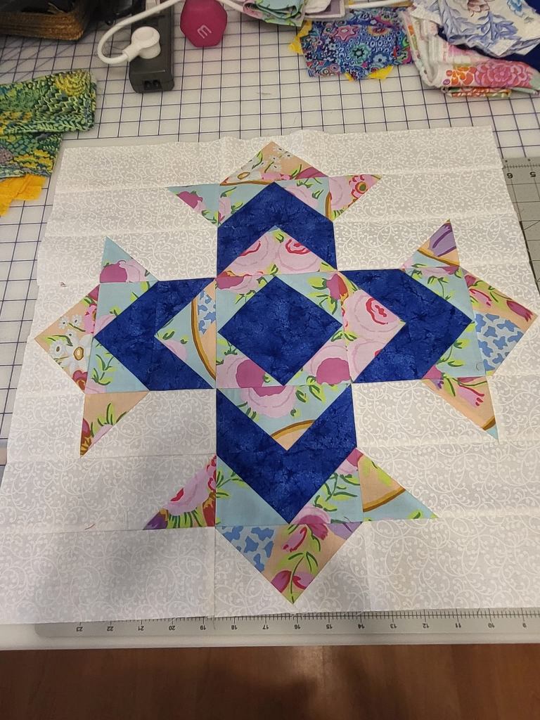 It took me a few months before I was mentally ready to work on it. I took it out and put it away several times. I was finally determined to finish it and a couple of weekends ago pulled it out again. I have to say, I honestly think the devil rallied hard for this quilt not to be made. It seemed an up hill struggle every time I worked on it. I realized I had not cut enough pieces for all 12 blocks and didn’t have any more of the fabrics. I reached out to a Facebook group for that fabric designer and several ladies sent me enough to finish each block. Should have been a piece of cake after that.