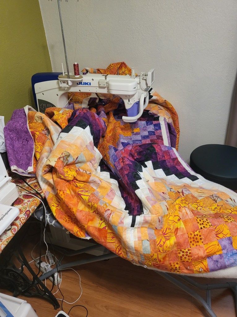 It was so large I thought I’d never finish it. Because of the size, I just quilted it with a large all over meander. I even had to put it on a rolling table to move it around to do the hand binding. 96 x 96 and I’m thrilled it’s done, but glad I did because I LOVE how it came out. Even though my furniture is teal it will hang on my living room wall soon since my rugs have teal, purple and orange in them.