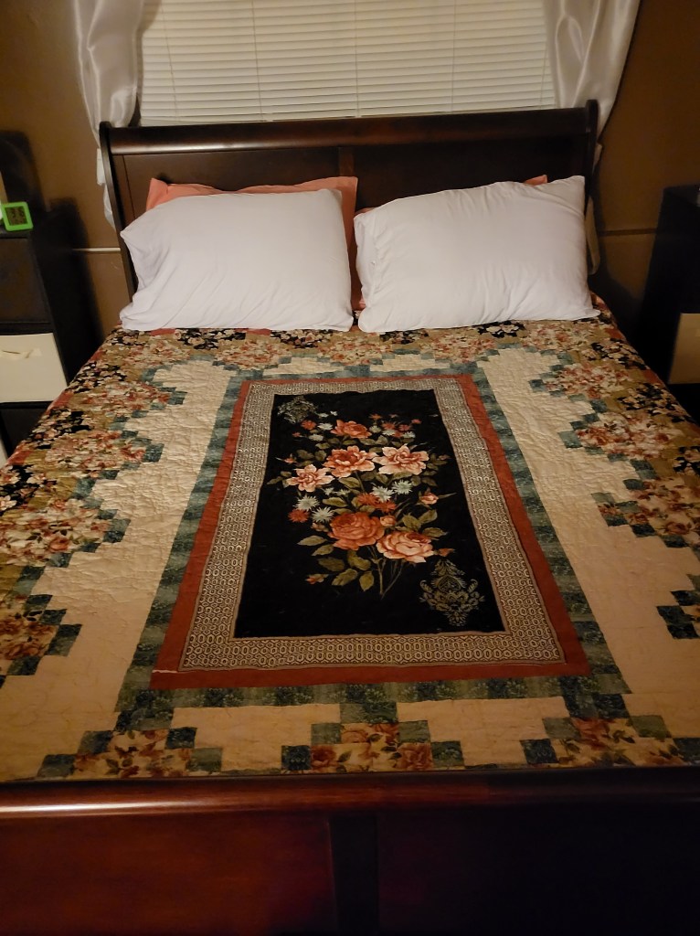 Funny thing is, I had to order a new rug because the other was stained with filth and trying not to spend more than I already had, I clicked on one I like because it was on sale for 70% off. It came and it’s the wrong color. I called the company and the color I wanted was not a sale item. The price difference was significant so the room will get a new quilt anyway. Go figure. But it looks good till I put down the rug and change it.