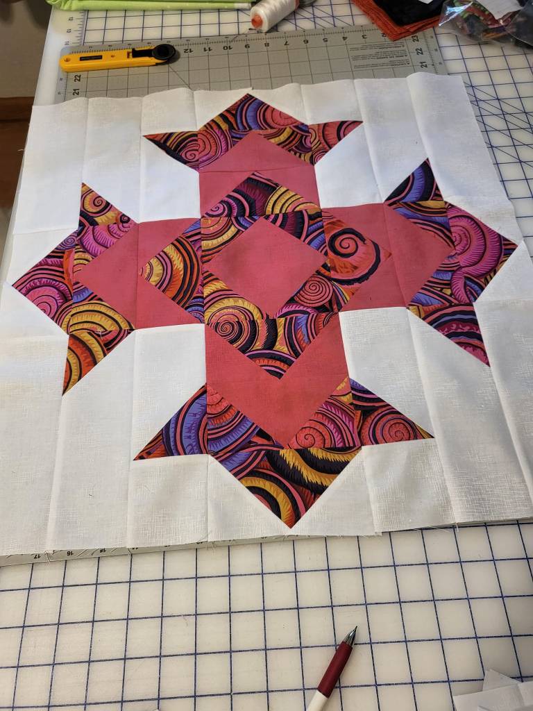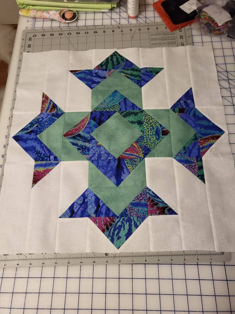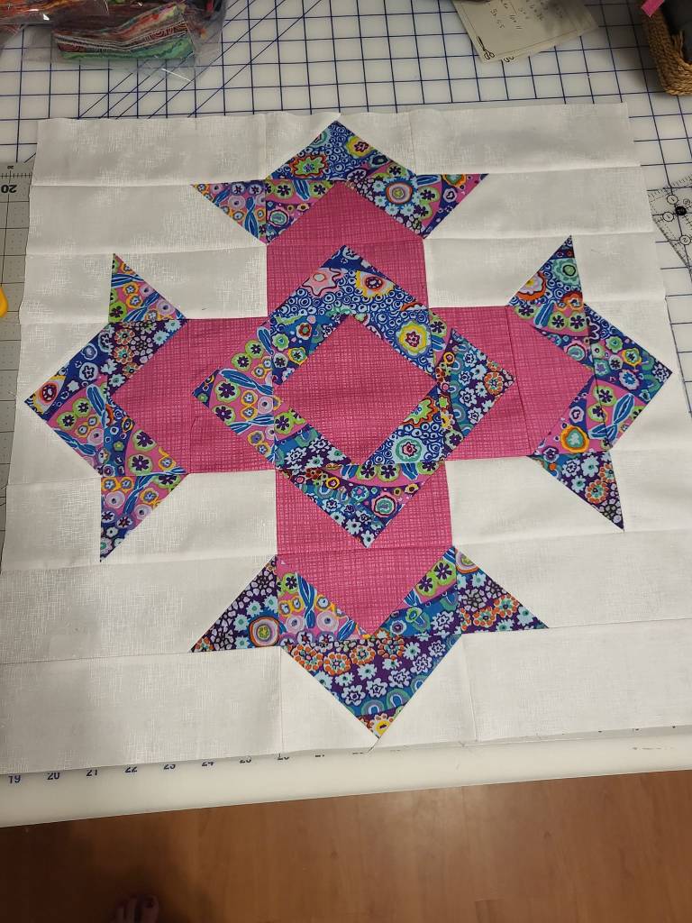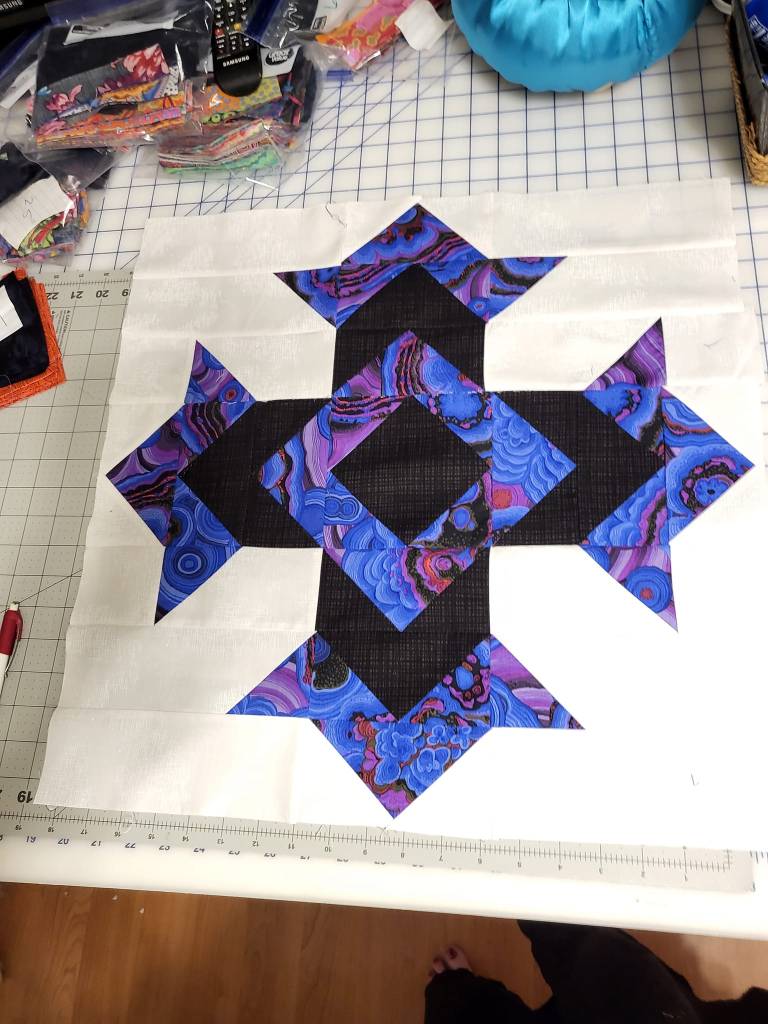 My dear friends Marilyn & Claudia’s Sunday school class is collecting money for one of the missionaries they support to build a new metal building. I offered to make a quilt they could raffle and what better one than like my sister’s memory quilt since the pattern is called God’s Eye. It will be 16 blocks all in a different color combo. I hope it sells a lot of tickets because I love the colors so far. I’ve finished 5 of the 16 blocks so far.