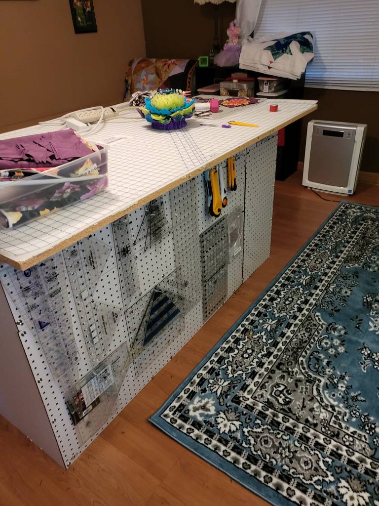 I am loving the space the new quilt room gives me. I use that space more than any other in my home so I’m glad to see it being used for what’s important to me. I have 3 machines set up on one wall so I can just move from machine to machine depending on what I’m working on. Robert set up my cutting/storage table in the middle of the room and let are area for pressing, relaxing and my longarm. I love that I can roll the design board where ever I want it. My favorite part of the entire room is the pegboard he added to the back of the cutting table.