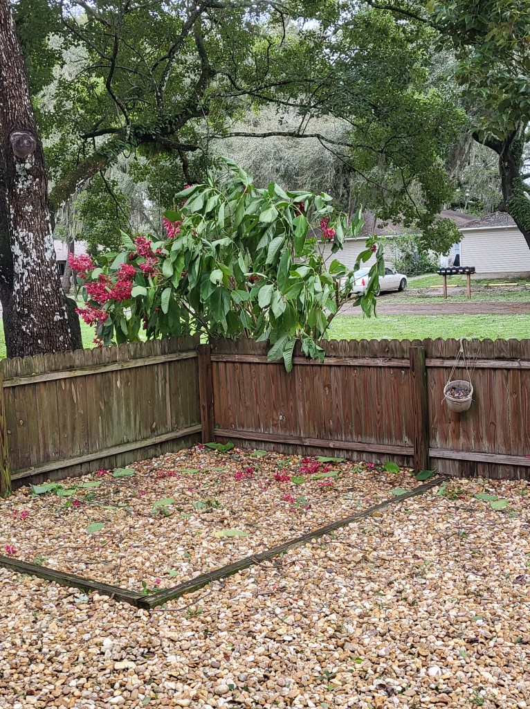 I am thrilled the kids had that 100 ft. tree taken down. Without a doubt it would have been laying on their house. I keep picturing the house falling on the witch and all that sticks out are those crazy socks. I just had a lot of yard clean up and I hope my cloak plant survives. It took a terrible beating and broke way back. Here is my before and after.