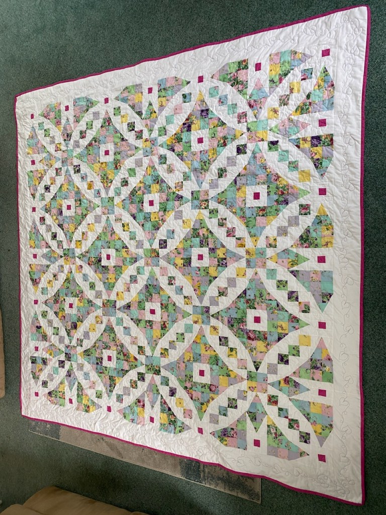 Marilyn finished her mystery quilt. It came out so soft and feminine looking. The pastels are so pretty. She is gifting it to a cousin starting breast cancer treatments. I think she’ll love it.